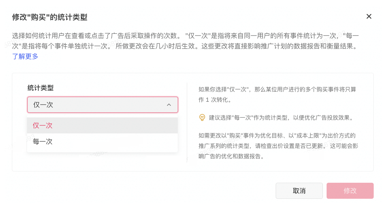 您可以利用以下两种方式,通过广告创编流或归因设置进行调整,更改 App 中 Purchase(付费事件)的统计类型为 Every(每一次),在 TikTok Ads Manger 激活 AEO 'Every' 产品的使用。