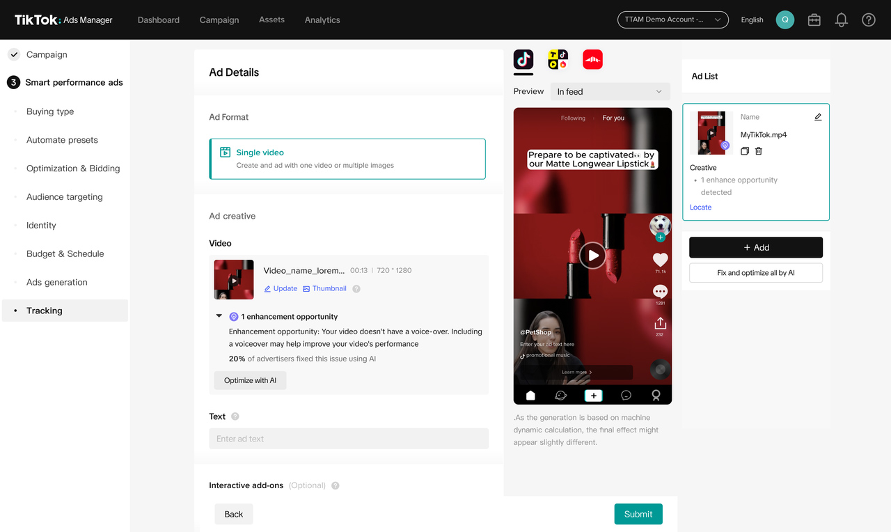 目前,Symphony 的创意优化功能已经嵌入到 TikTok Ads Manager 的广告创编流程中,您可以利用它充分激发 TikTok 广告组的潜力。它能利用 AI 帮助您简化广告创建流程,摆脱手动优化的繁琐。