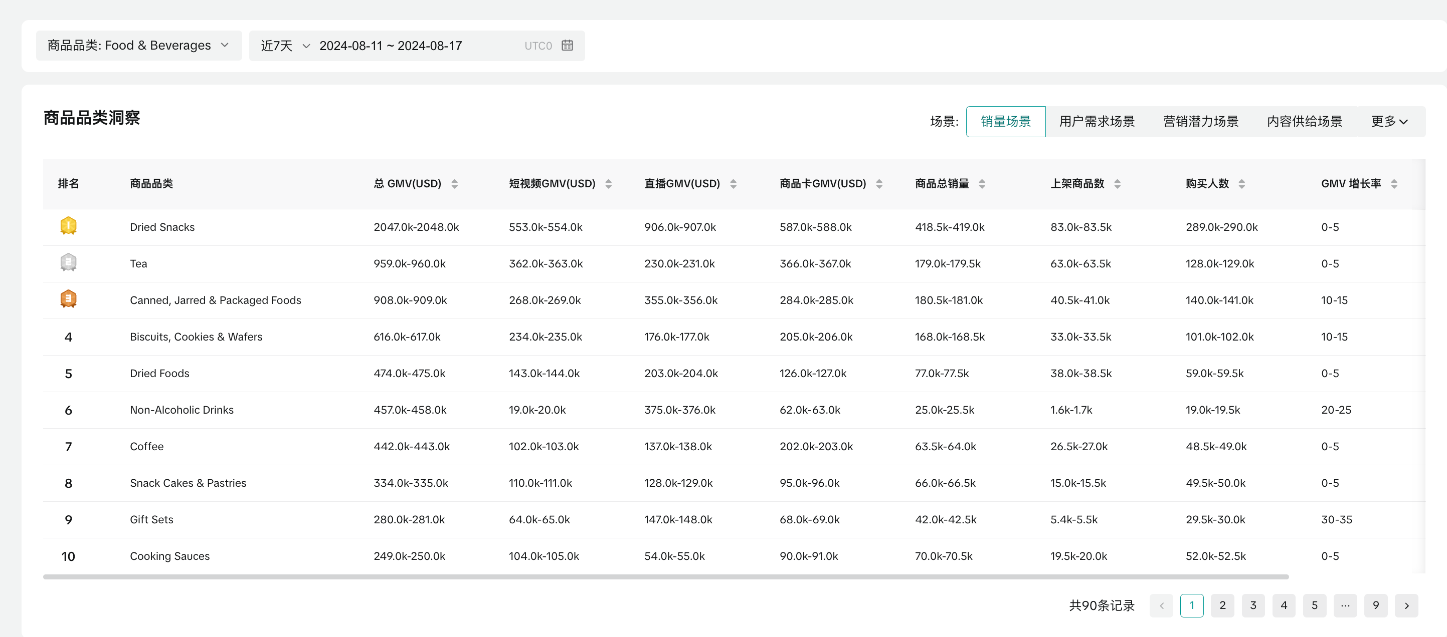 • 品类洞察:通过电商销量、用户需求、市场潜力和内容供给等预设洞察场景,了解类目排名风向。