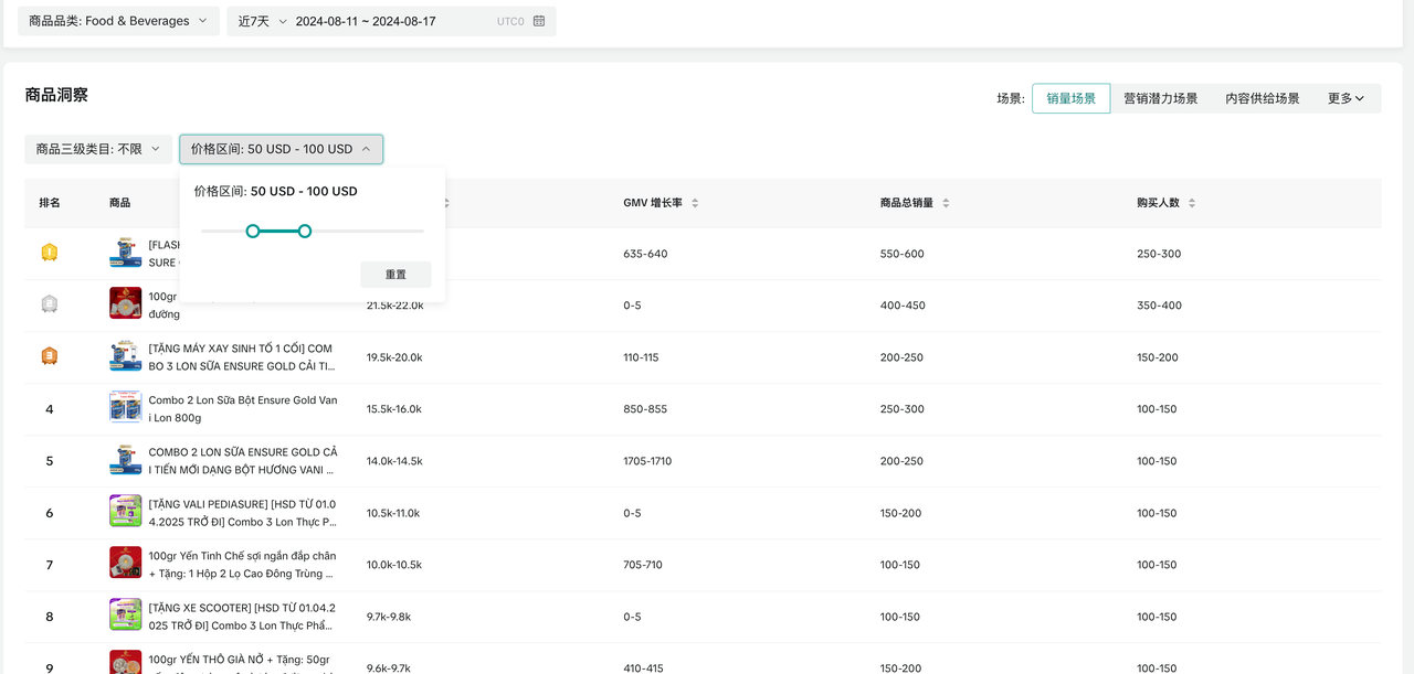 • 热门选品:基于不同预设洞察场景以及自定义价格段区间,了解行业热门商品趋势。