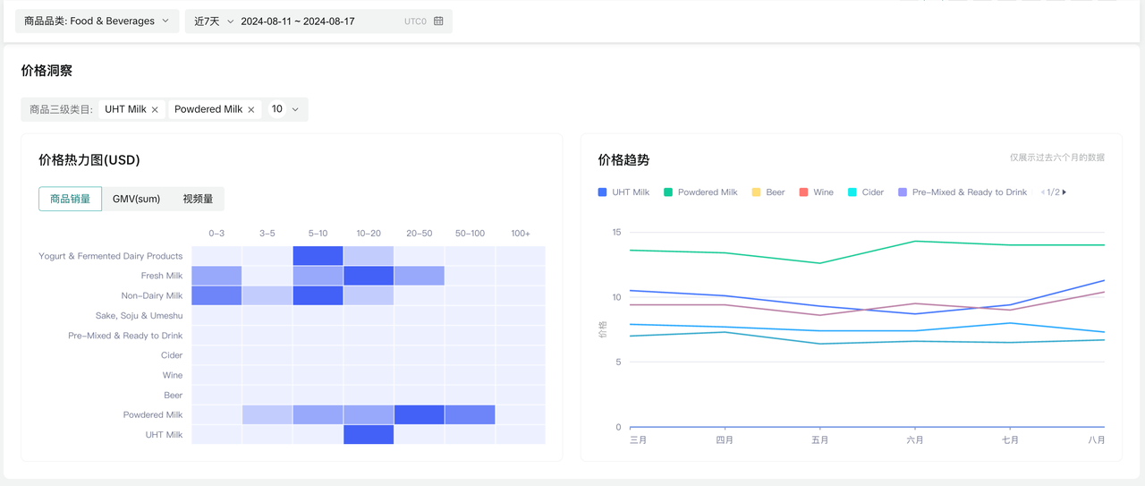 • 定价策略:追踪三级类目在不同价格段(by 销量/GMV/短视频数量)的分布以及时间趋势变化。