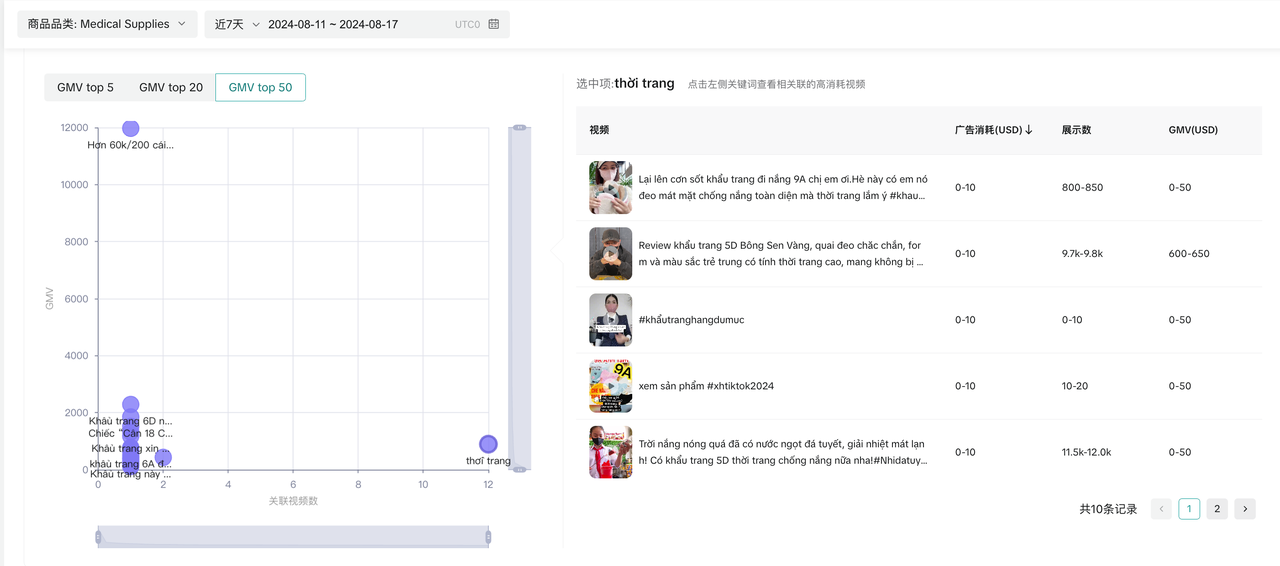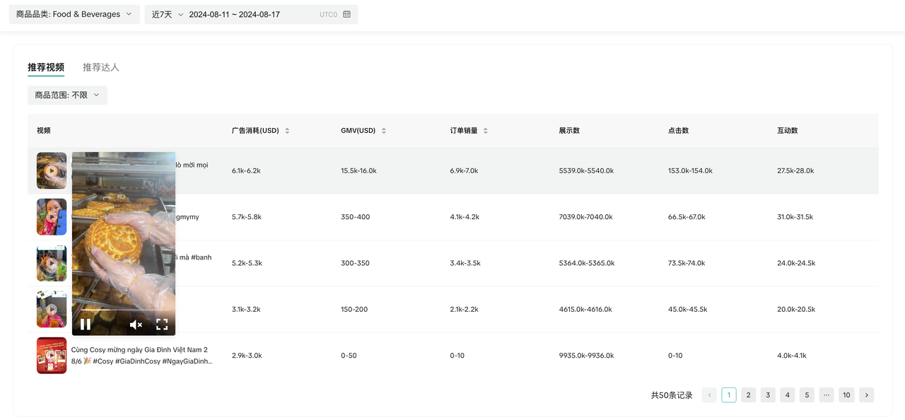 • 视频/达人推荐:类目下热门带货短视频榜单、热门带货达人榜单,提供参考选择。