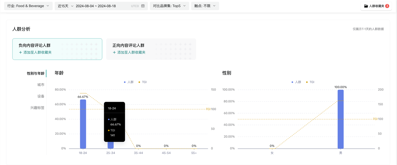 ○ 人群分析:针对搜索/正负向评论等品牌人群,提供多维度画像分析,并支持圈包推送广告平台进行投放。