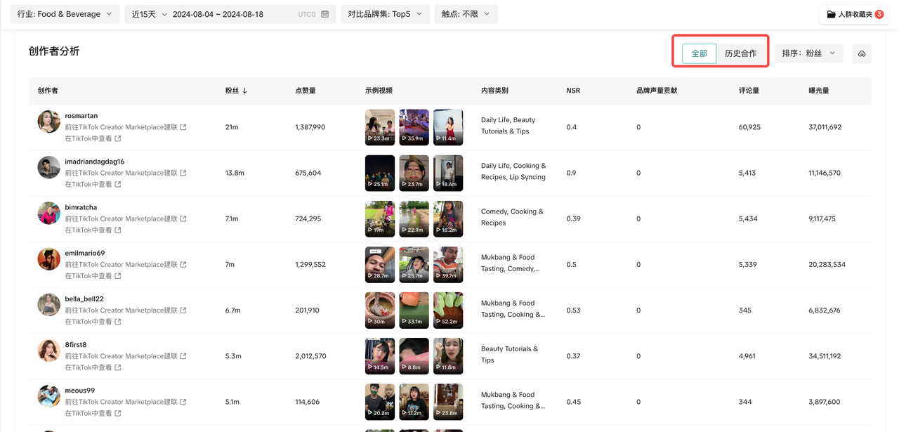 ○ 创作者分析:提供行业创作者榜单,商家可以根据创作者粉丝数、点赞量、品牌声量贡献度等信息进行排序优选。