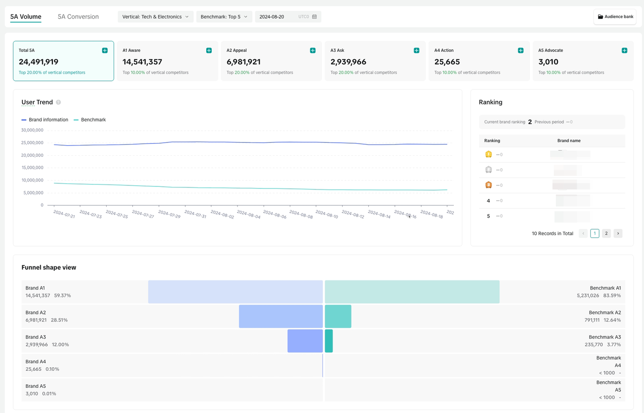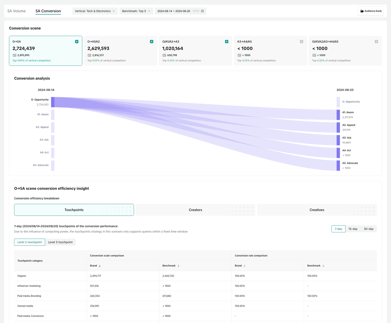 基于品牌在 TikTok 上的全量数据,按照消费者与品牌的关系远近,并通过科学化计算,构建品牌 5A 人群模型。
