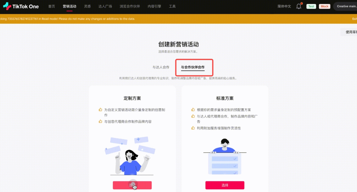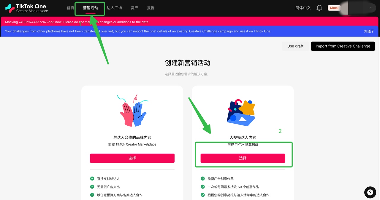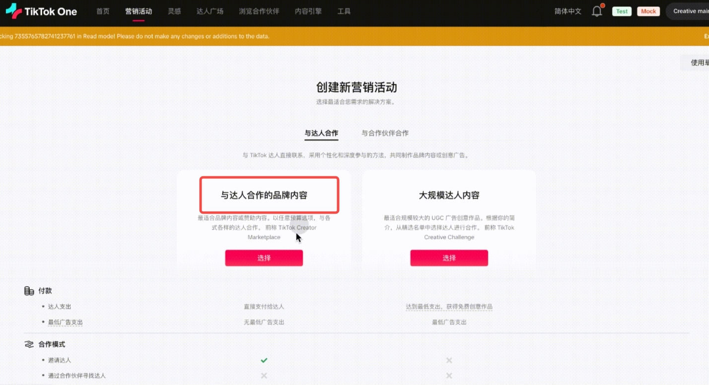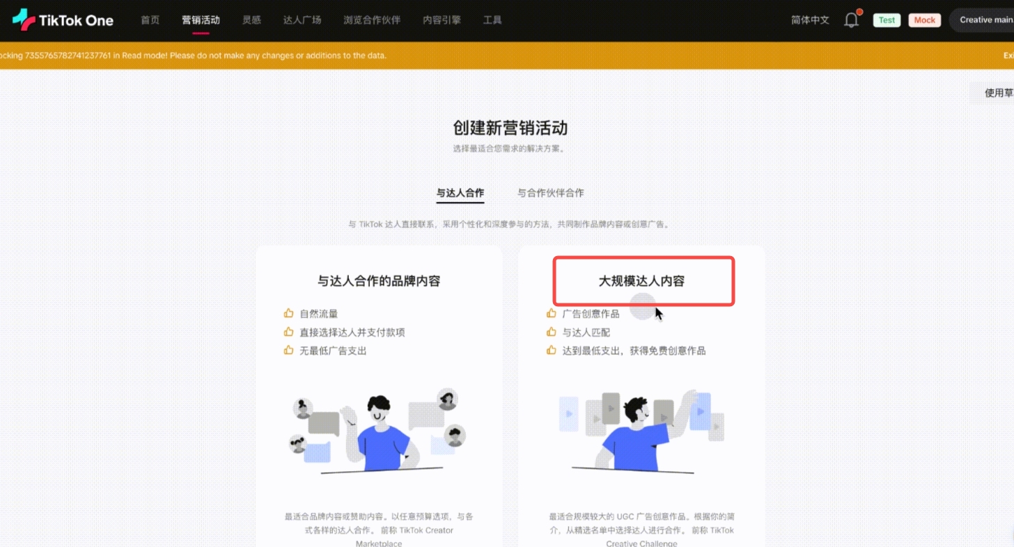 • 点击“营销活动”,创建一个营销活动,选择右边的“大规模达人内容”