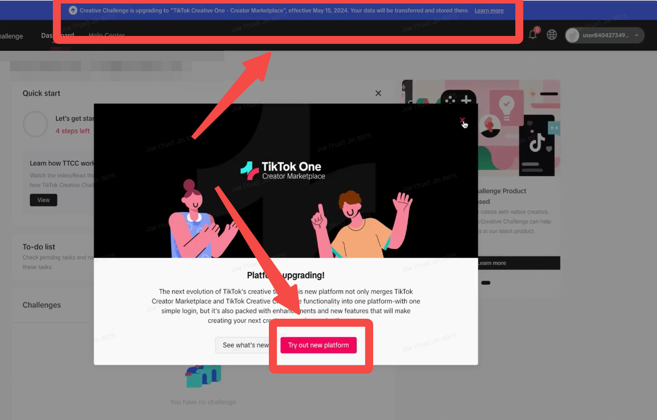 Step 1:登录旧平台 TikTok Creative Challenge TikTok Creator Marketplace,会看到一个弹窗或蓝色 banner,提示可以前往新平台,点击“Try out new platform(访问新平台)