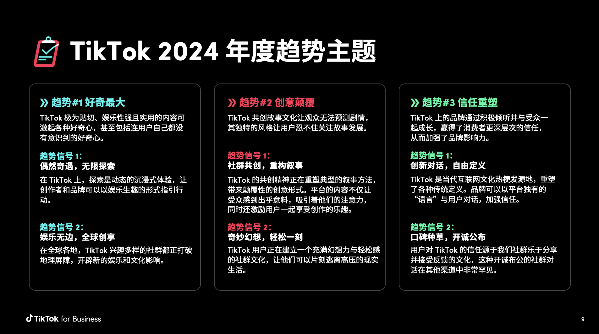 在 TikTok 上实现突破意味着,广告主需要将“勇于尝试,大胆破局”这一理念充分地融入到日常的营销策略当中。 基于此理念,我们通过分析那些生命周期更长、影响力更大且具有行动指导意义的常青趋势,总结出了三大年度趋势主题:「好奇最大」、「创意颠覆」与「信任重塑」,为品牌 2024 年在 TikTok 内外的营销策略提供指引。