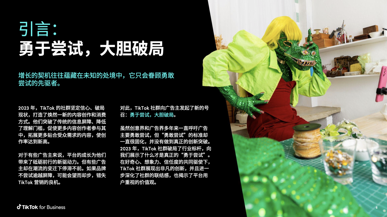 虽然创意界和广告界多年来一直呼吁广告主要勇敢尝试,但“勇敢尝试”的标准却一直很固化,并没有做到真正的创新突破。2023 年,TikTok 社群刷新了行业标杆,向我们展示了什么才是真正的“勇于尝试”。在好奇心、想象力、信任度的共同驱使下, TikTok 社群展现出非凡的创造力和创意,并且进一步深化了社群的联结感,也揭示了平台用户重视的价值观。
