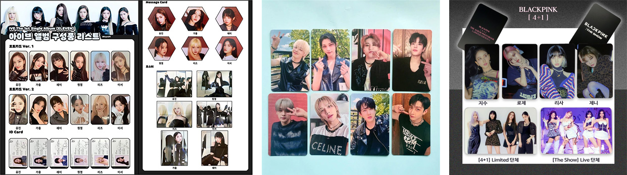 在 K-Pop 世界里,艺人的照片卡对粉丝来说非常重要。每张专辑中都会有不同类型的照片卡:普通专辑卡廉价普通,而特别版卡则稀有珍贵。此外,还有随服装或海报附赠的周边卡,以及签售活动中赠送的签售卡。最稀有的是公放卡,赠予现场观看演出的粉丝。粉丝们喜欢收集这些卡片,这使它们成为了 K-Pop 文化中的重要组成部分。