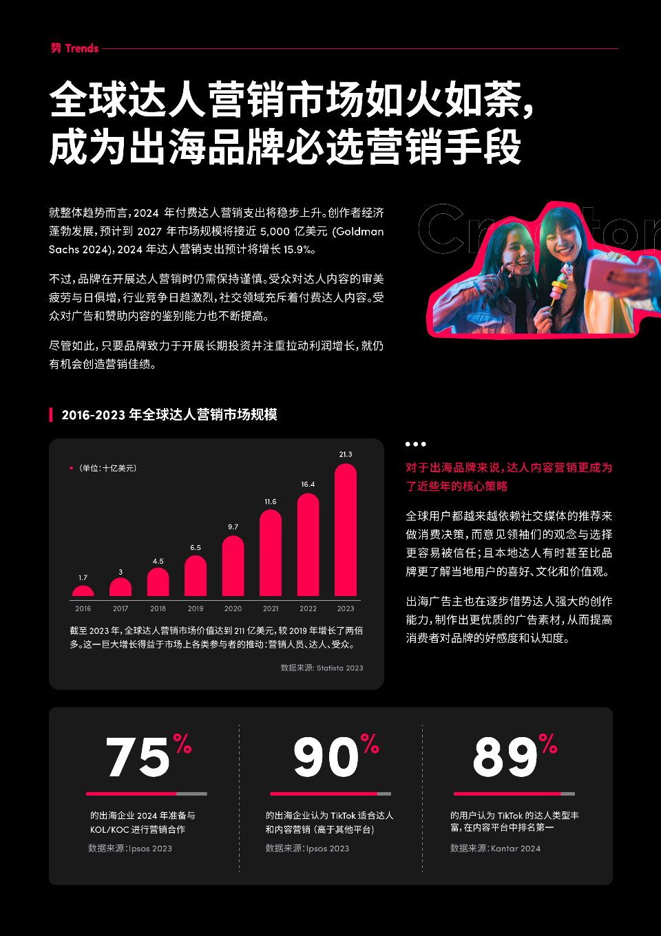 由此,《2024年出海达人营销白皮书》应运而生。TikTok for Business 经过大量的调研、访谈和实践,对全球达人营销进行深度解构。基于海量 TikTok 达人合作经验,TikTok for Business 希望为出海企业部署达人营销找到专属的“势、道、术、器”,帮助有需要的企业探索合适的达人营销策略,并进行有效落地,为企业整体的出海营销战略整合提效。